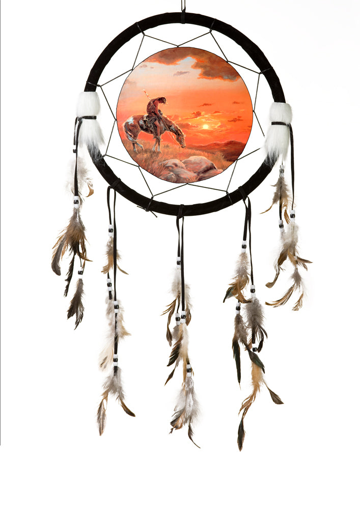 Material: Kunststoffrahmen, Lederimitat, Fotodruckpapier und Hühnerfedern